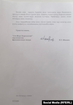 Фотокопия письма, где якобы Нурланбек Шакиев обращается к генпрокурору Курманкулу Зулушеву.